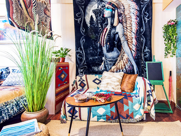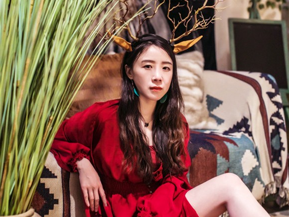 白色的墙面简单的装饰着波西米亚风的画布和一闪一闪的小灯,精致不浮夸,这是我们美照的主要拍摄地,各种美腻感。